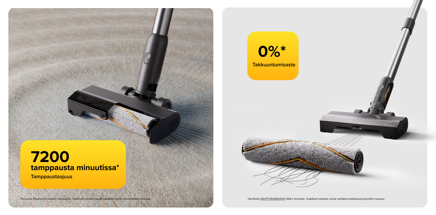 Täydellinen kumiliuskojen ja pehmeiden kuitujen yhdistelmä toimii taianomaisesti sekä matoilla että kovalla lattialla. Kumiliuskat irrottavat takertuneen lian 7 200 tamppauksella minuutissa ja pehmeät harjakset nappaavat hienon pölyn ja roskat.
