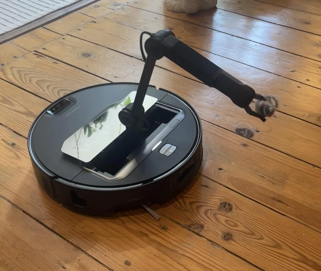 1. Siivouksen jälkeen robottivarsi ojentuu ja siirtää nostetut esineet sivuun, jolloin robotti voi siivota niiden aiemmin peittämät alueet optimaalisen siivoustuloksen aikaansaamiseksi.